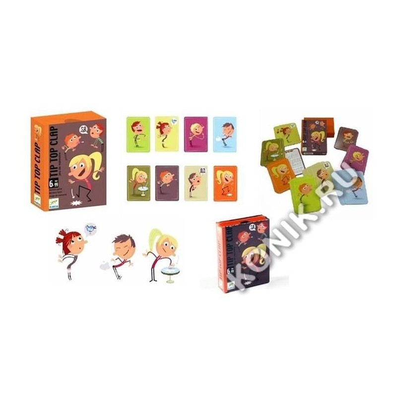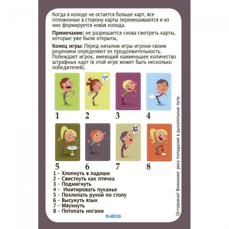 В набор входит колода из 32 карт с изображением различных заданий (1- похлопать в ладоши, 2- посвистеть, 3- подмигнуть, 4- изобразить «пук», 5- ударить по столу рукой, 6- показать язык, 7- помяукать, 8 – постучать по полу ногой), инструкция с правилами. Играть можно вдвоем или компанией до 5 человек. Колода кладется в центре, игроки по очереди вытаскивают карты с заданием, при этом необходимо выполнить не только свое, но и повторить все предыдущие в правильной последовательности. Тот, кто допускает ошибку, получает штрафную карту. Длительность игры определяют сами дети, победителем становится игрок с минимальным количеством карт.