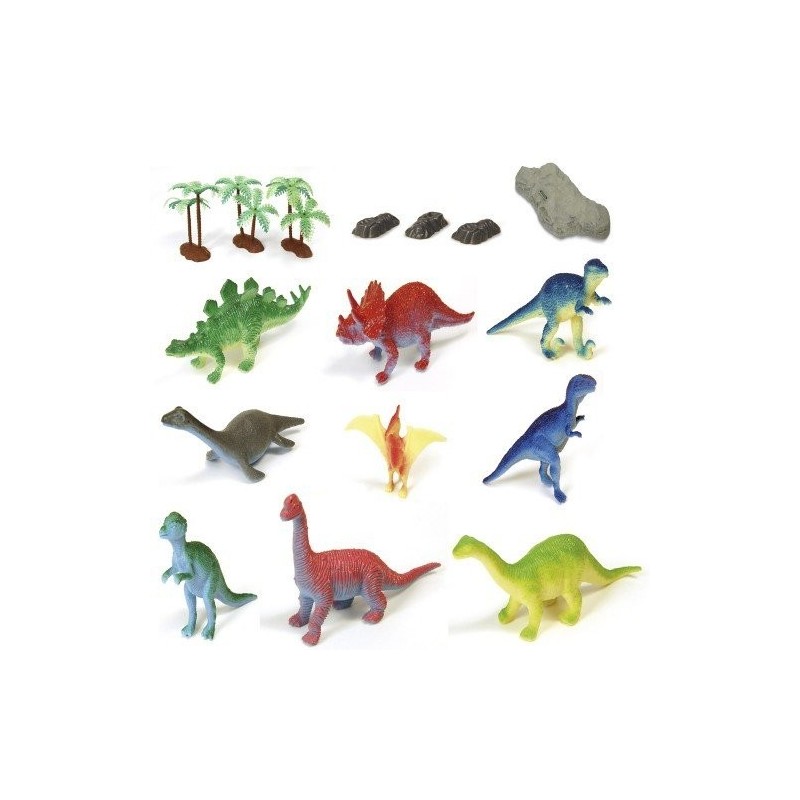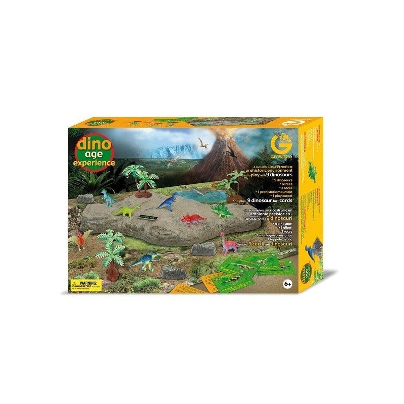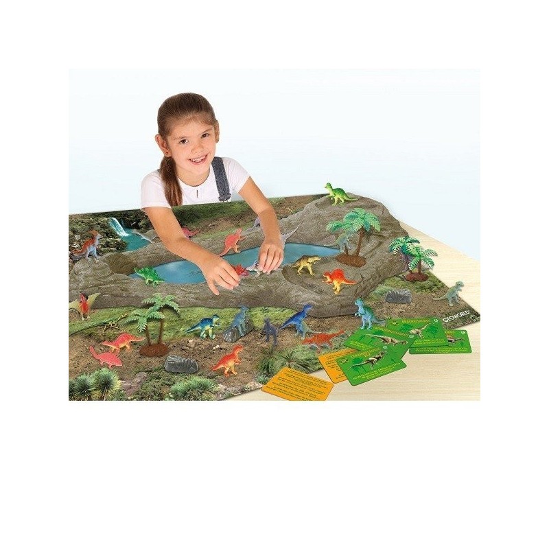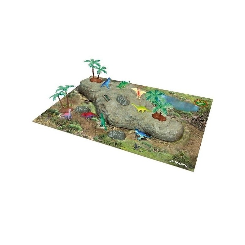 Набор динозавров, раскрашенных вручную, с игровым полем. К каждому динозавру прилагается карточка с научной информацией о нем. Игрушки компании GeoWorld одобрены мировым палеонтологическим сообществом.