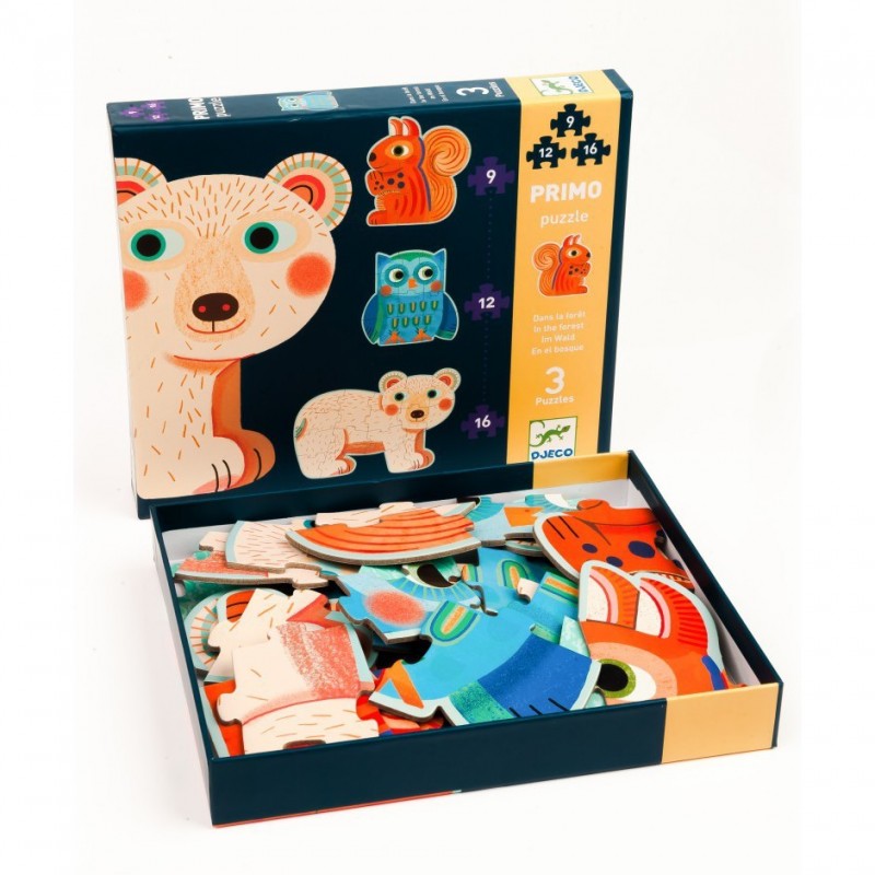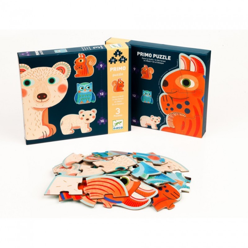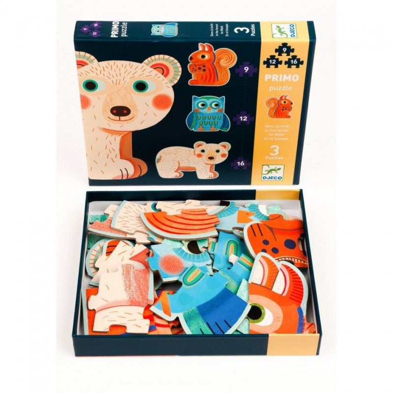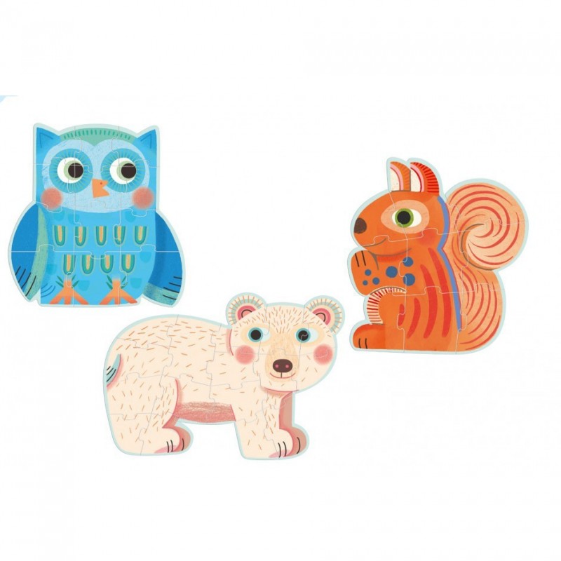 Пазлы "В лесу" , 3 в 1 - это красочные картинки с животными. Крупные элементы с красочными рисунками отлично подходят для маленьких любителей складывания пазлов, все элементы идеально соединяются и изготовлены из плотного картона. Картинки одинакового размера с усложнением на 9, 12, 16 эл.